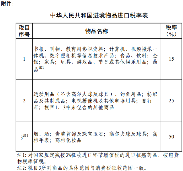 调整后的《中原国民中华共和国进境展品进出口所得税率表》见辅助件 。