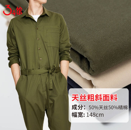 天丝粗斜布料:布料的成份为50%天丝+50%精棉 ,织物整体吸湿透气性特别不错 ,手感细腻且特别亲肤 ,做成阔腿裤后有着很好的悬垂性 ,布料价格为33元每米 。