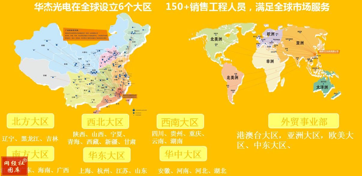 华杰光电在2012年正式成立海峡彩亮光电产业园 ,并在华东、华南、华中、华北等区域建立了近百家省级经销商 ,满足了新疆 ,内蒙、宁夏、西藏、青海偏远地区对显示屏的需求 。华杰拥有2000多家线下展厅 ,并在东南亚、欧洲、美洲、中东等35个国际区域建立了数百家的代理商 。其中在土耳其、俄罗斯、伊朗、迪拜、英国、荷兰、新加坡等区域的业务成为华杰进军国际市场重要战略布局 。